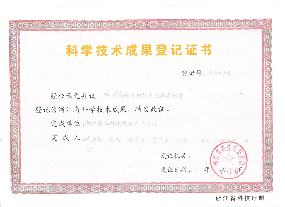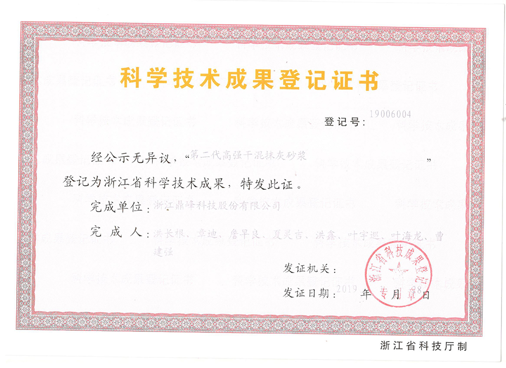 公司為國家級“專精特新”小巨人企業,國家級高新技術企業,擁有與多家高校聯合組建的省級研發中心。公司經浙江省散裝水泥發展中心、浙江省建筑業管理局備案,為浙江省首批通過試驗室驗收的企業。近年來公司陸續通過了質量管理體系認證、干混砂漿產品認證、環境管理體系認證、能源管理體系認證、職業健康管理體系認證、中國綠色建材產品認證、工業化與信息化融合管理體系評定。自2017年起公司已連續五年被中國建筑材料聯合會預拌砂漿分會評為“全國預拌砂漿行業先進企業/優秀企業/最具推動力企業”。